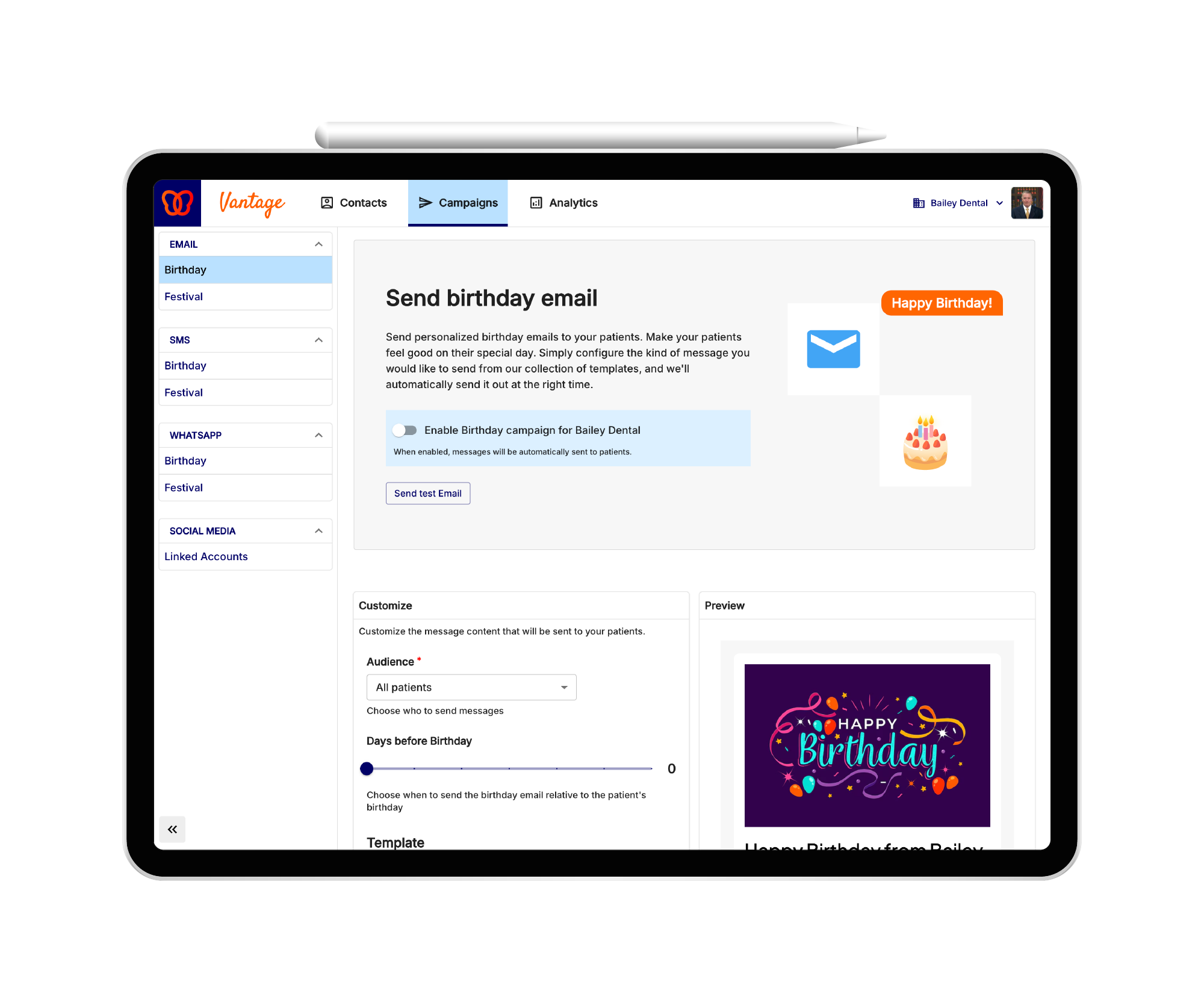 When it comes to choosing and staying with a dentist, trust is the number one reason cited by patients. And it's the little things that matter when it comes to building trust. Remember their birthdays, joining in celebrations. With Vantage, you can rest assured that you don't forget the things that matter.
